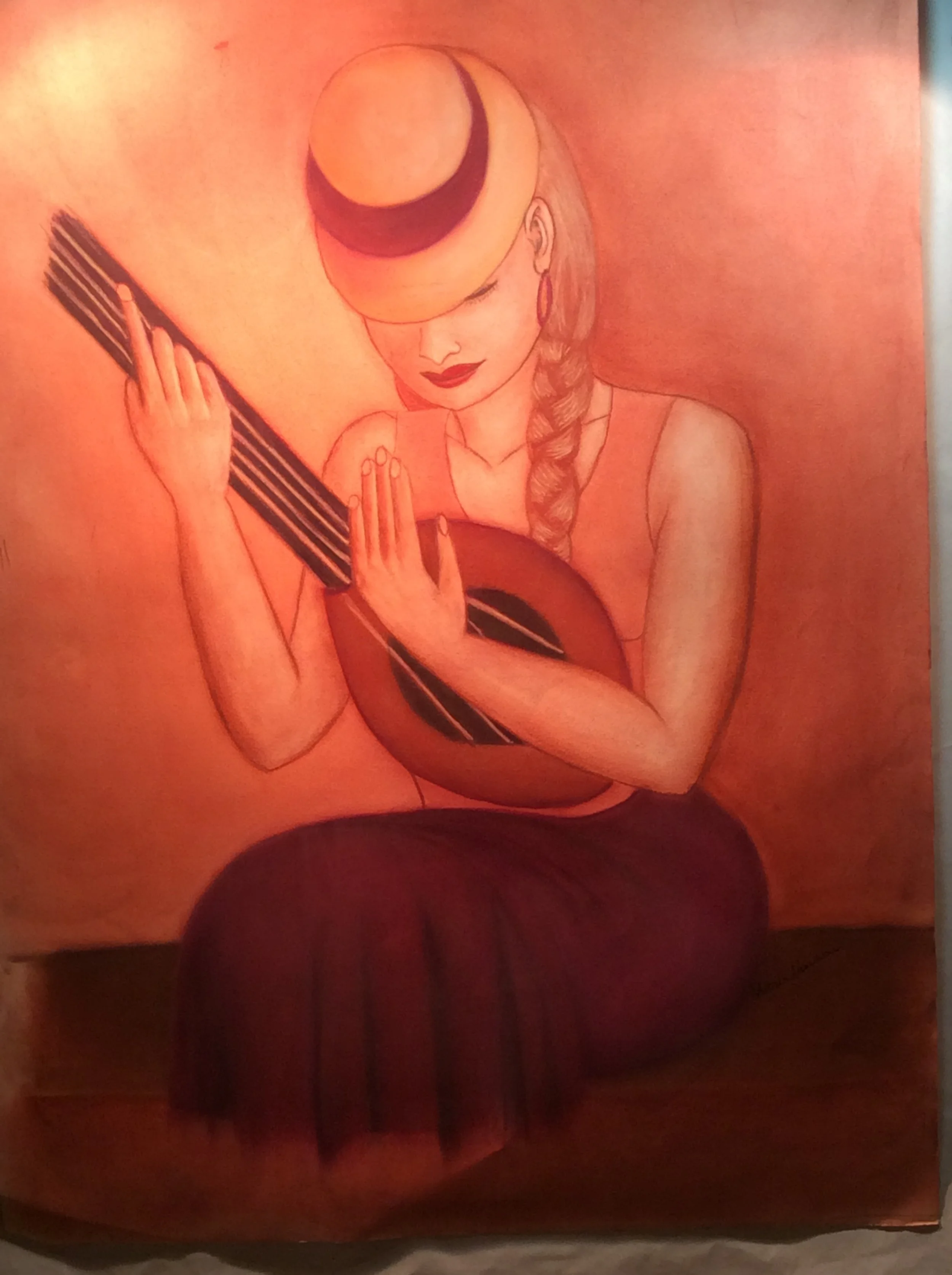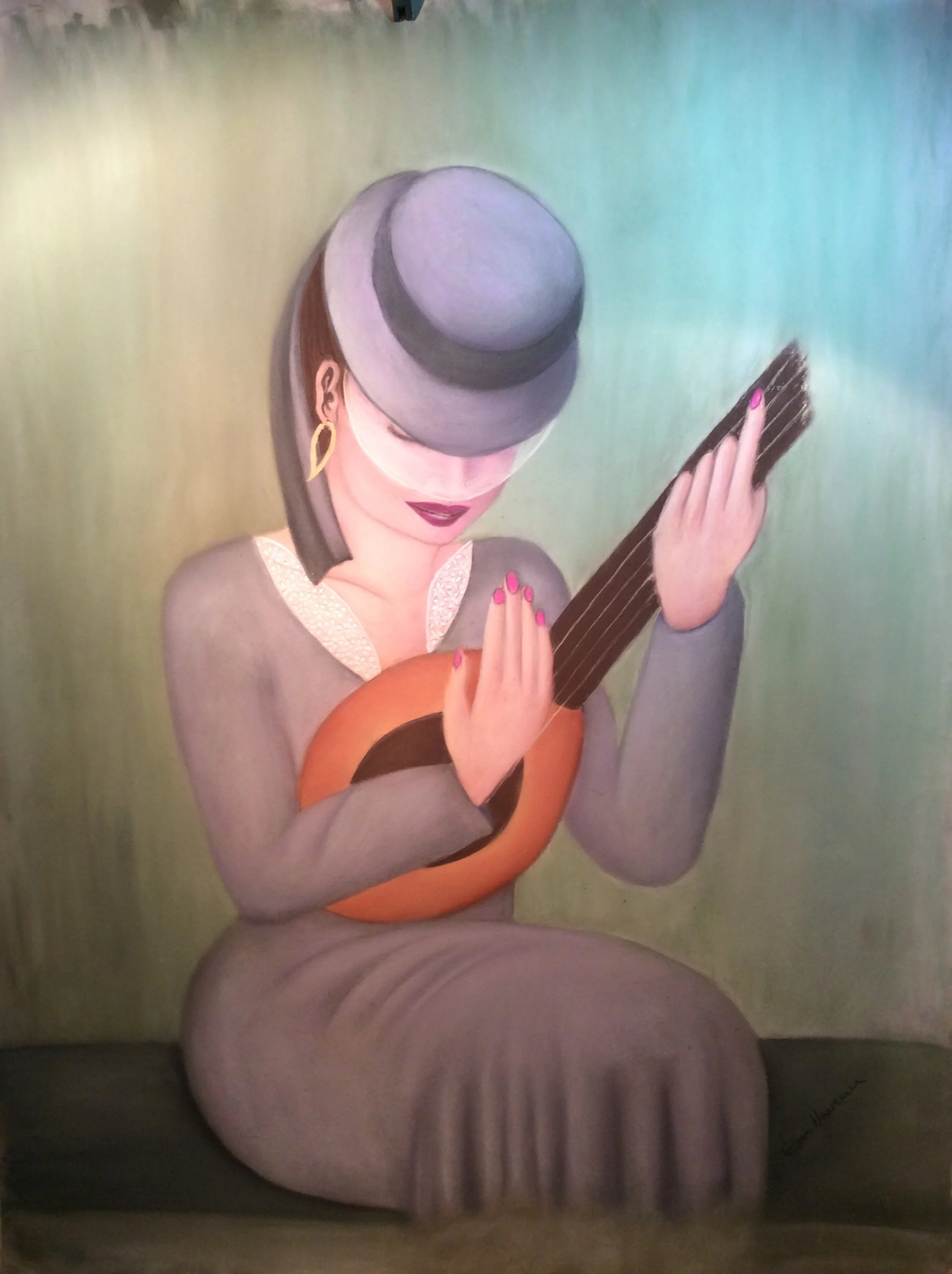 Cavalière en gris avec voilette jouant de la guitare